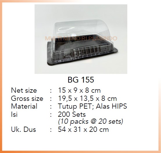 Net size : 15 x 9 x 8 cm Gross size : 19,5 x 13,5 x 8 cm Material : Tutup PET; Alas HIPS Isi : 200 sets (10 packs @20 sets) Uk. Dus : 54 x 31 x 20 cm