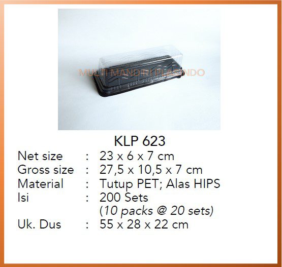Net size : 23 x 6 x 7 cm Gross size : 27,5 x 10,5 x 7 cm Material : Tutup PET; Alas HIPS Isi : 200 sets (10 packs @ 20 sets) Uk. Dus : 55 x 28 x 22 cm